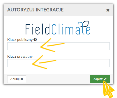 Wtedy pojawi się okno do autoryzacji integracje gdzie należy przekazać tzw. klucze HMAC. Do tego wystarczy skopiować Klucz publiczny oraz Klucz prywatny z portalu FieldClimate do okna autoryzacji i zapisać podane wartości.